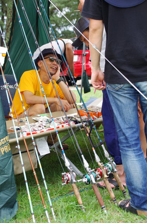 スーパーストライクデイの一コマ。メキシコ帰りのスミス社の玉越さんと津波ルアーズの元木さんによる、先日のメキシコ釣行に関するディープな対談が。グリーンのキャップはクラブの広報を務められる三浦さん。丸つば帽子の後ろ姿は、ハンドサムの嶋崎さん